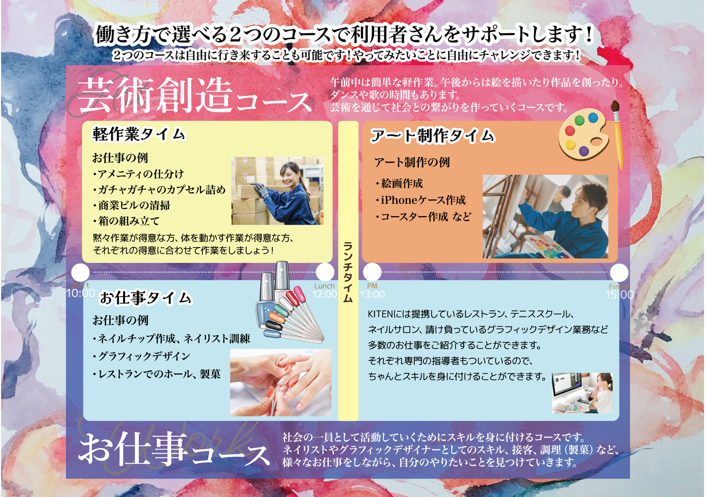 楽しみながら仕事のスキルを身につけるコースです。簡単な軽作業から専門的な技術まで、さまざまな仕事にチャレンジできます。